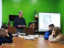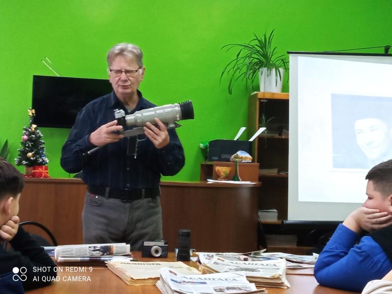 Затем, главный её редактор в период с 1994 по 2005 года - Евгений Алексеевич Коновальцев, подробно рассказал ребятам о профессии фотокорреспондента, его обязанностях и специфике работы на примерах из личного опыта и профессиональной практики.